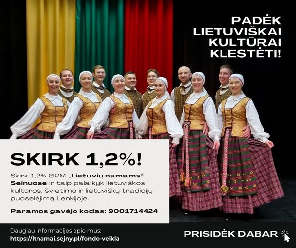 Skirk 1,2% GPM „Lietuvių namams“ Seinuose ir prisidėk prie lietuviškos kultūros, švietimo ir tradicijų puoselėjimo Lenkijoje!