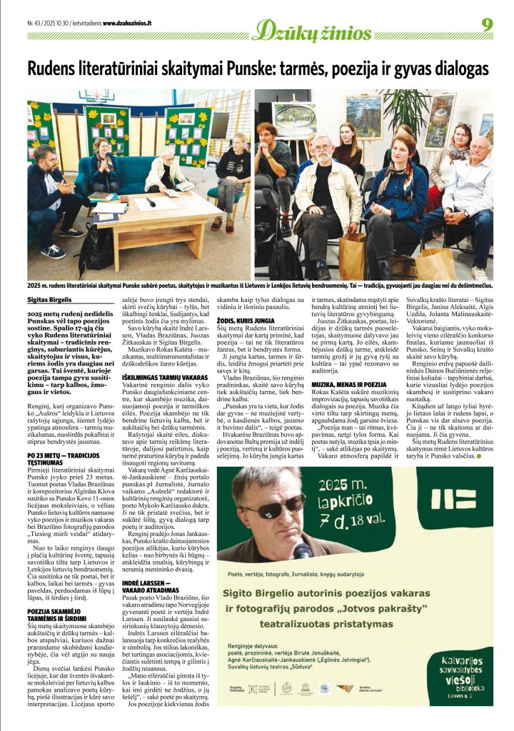 2025 metų rudenį nedidelis Punskas vėl tapo poezijos sostine. Spalio 17-ąją čia vyko Rudens literatūriniai skaitymai – tradicinis renginys, suburiantis kūrėjus, skaitytojus ir visus, kuriems žodis yra daugiau nei garsas. Tai šventė, kurioje poezija tampa gyvu susitikimu – tarp kalbos, žmogaus ir vietos.