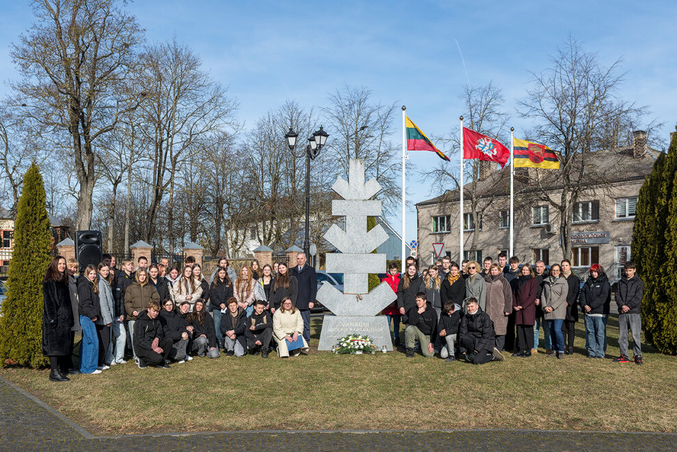 Po pamokos savivaldybės vadovai ir gimnazijos mokiniai prie Adolfo Ramanausko-Vanago paminklo padėjo gėlių, uždegė atminimo žvakeles ir tylos minute pagerbė partizanų vadą.