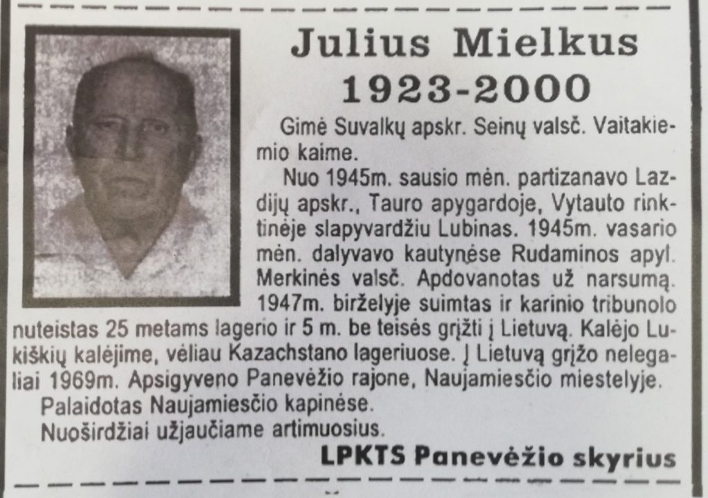 Tęsiame pasakojimą apie Vaitakiemio kaime gimusį Julių Mielkų-Lubiną, kuris už partizaninę veiklą buvo nubaustas 25 metams tremties ir išvežtas į Sibirą.